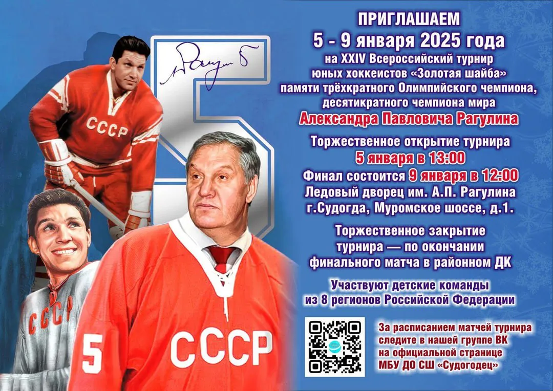 С 5 января в Ледовом дворце города Судогда начнётся 24-й Всероссийский турнир юных хоккеистов «Золотая шайба» памяти трёхкратного олимпийского чемпиона и десятикратного чемпиона мира Александра Рагулина. В этом году участие примут команды из Владимирской, Ивановской, Кировской, Московской и Смоленской областей, а также из Башкортостана и Удмуртии.