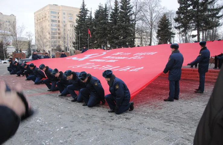 Масштабную копию Знамени Победы торжественно развернут на территории трёх образовательных учреждений – Владимирского государственного университета, филиала Президентской академии и Владимирского юридического института ФСИН России.