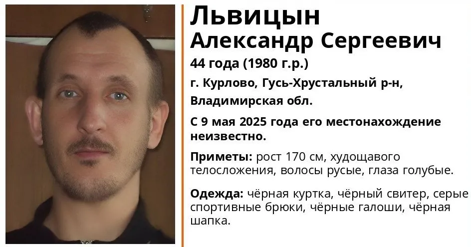 Александр Львицын исчез несколько дней назад, его судьба остается неизвестной. Как сообщает Поисковый отряд «ЛизаАлерт» Владимирской области, 44-летний житель города Курлово не выходит на связь с 9 мая 2025 года.
