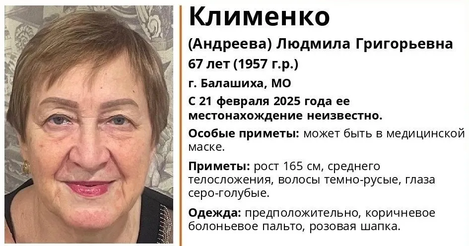Во Владимирской области и Московском регионе разыскивают 67-летнюю Людмилу Григорьевну Клименко (Андрееву) из городского округа Балашиха. Женщина пропала 21 февраля 2025 года, с тех пор ее местонахождение остается неизвестным.