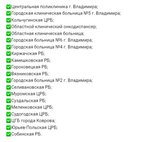 В рамках этого проекта во Владимирской области было подключено 22 цифровых маммографических аппарата в 20 медицинских организациях, включая Центральную поликлинику г. Владимира, Городскую клиническую больницу №5 г. Владимира и другие учреждения здравоохранения региона: