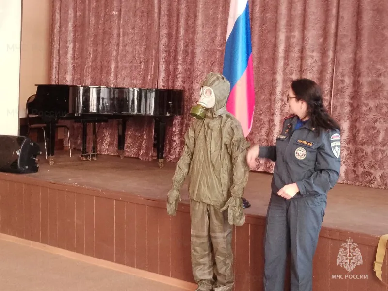 Кроме того, школьникам были продемонстрированы средства индивидуальной защиты, такие как защитный костюм Л-1 и противогаз, с объяснением правил их использования и возможностью примерки.