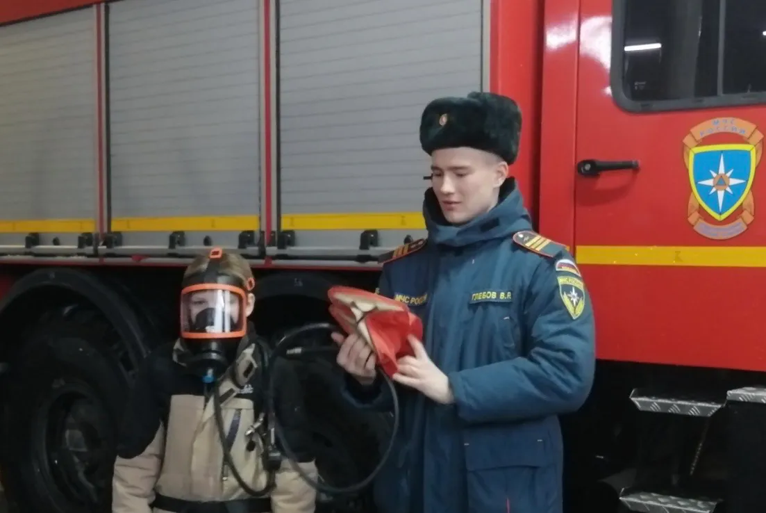 Экскурсию провёл опытный пожарный Владимир Глебов, который уже много лет трудится в МЧС. В 2025 году он в составе команды Владимирской области представлял регион на соревнованиях Центрального федерального округа за звание «Лучшая команда МЧС России по проведению аварийно‑спасательных работ при ликвидации последствий аварий на автомобильном транспорте».