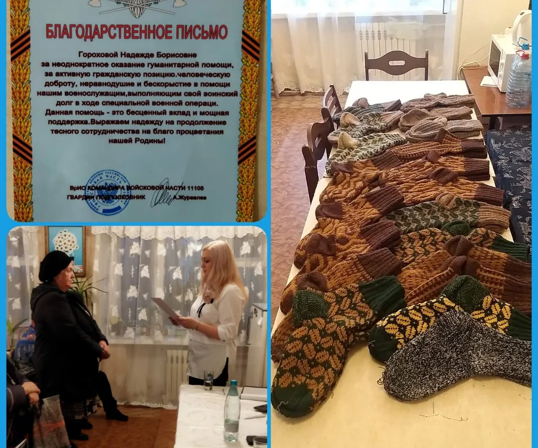 Муромлянка Надежда Горохова связала 20 пар шерстяных носков для военнослужащих, находящихся сейчас в зоне СВО. Об этом сообщил в своей группе Комитет му3ниципального управления округа Мурома. За свой благотворительный вклад Надежда Борисовна получила благодарственное письмо от руководства войсковой части, куда было переданы теплые изделия.